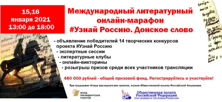 15 и 16 января 2021 года, с 13:00 до 18:00 (московское время), при поддержке членов Общественной палаты Российской Федерации будут проводиться экспертные обсуждения и литературные клубы в рамках Второго Международного Конгресса волонтёров познавательного туризма, культуры и медиа «Живое наследие малой родины» и Литературного Фестиваля #Узнай Россию. Донское слово