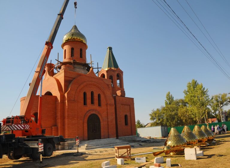 Ранним погожим утром в центре х. Потапов у строящегося храма святого благоверного князя Александра Невского было многолюдно. Православные собрались по поводу значимого события — установки куполов на храм.