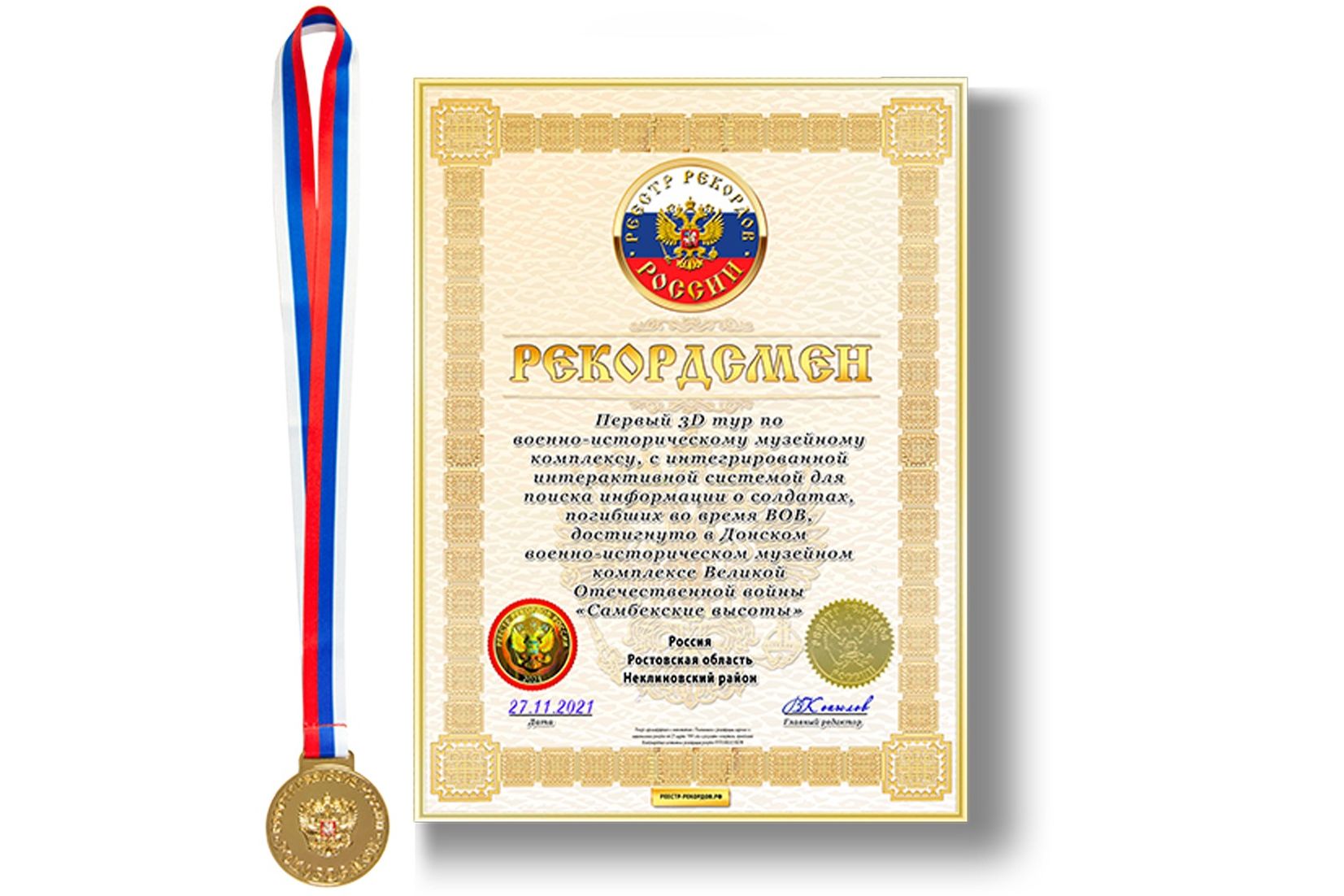 Международное агентство «Интеррекорд» зарегистрировало на Дону новый рекорд – «Первый 3D-тур по военно-историческому музейному комплексу, с интегрированной интерактивной системой для поиска информации о солдатах, погибших во время Второй мировой войны». Об этом сообщил замгубернатора Ростовской области Артем Хохлов.