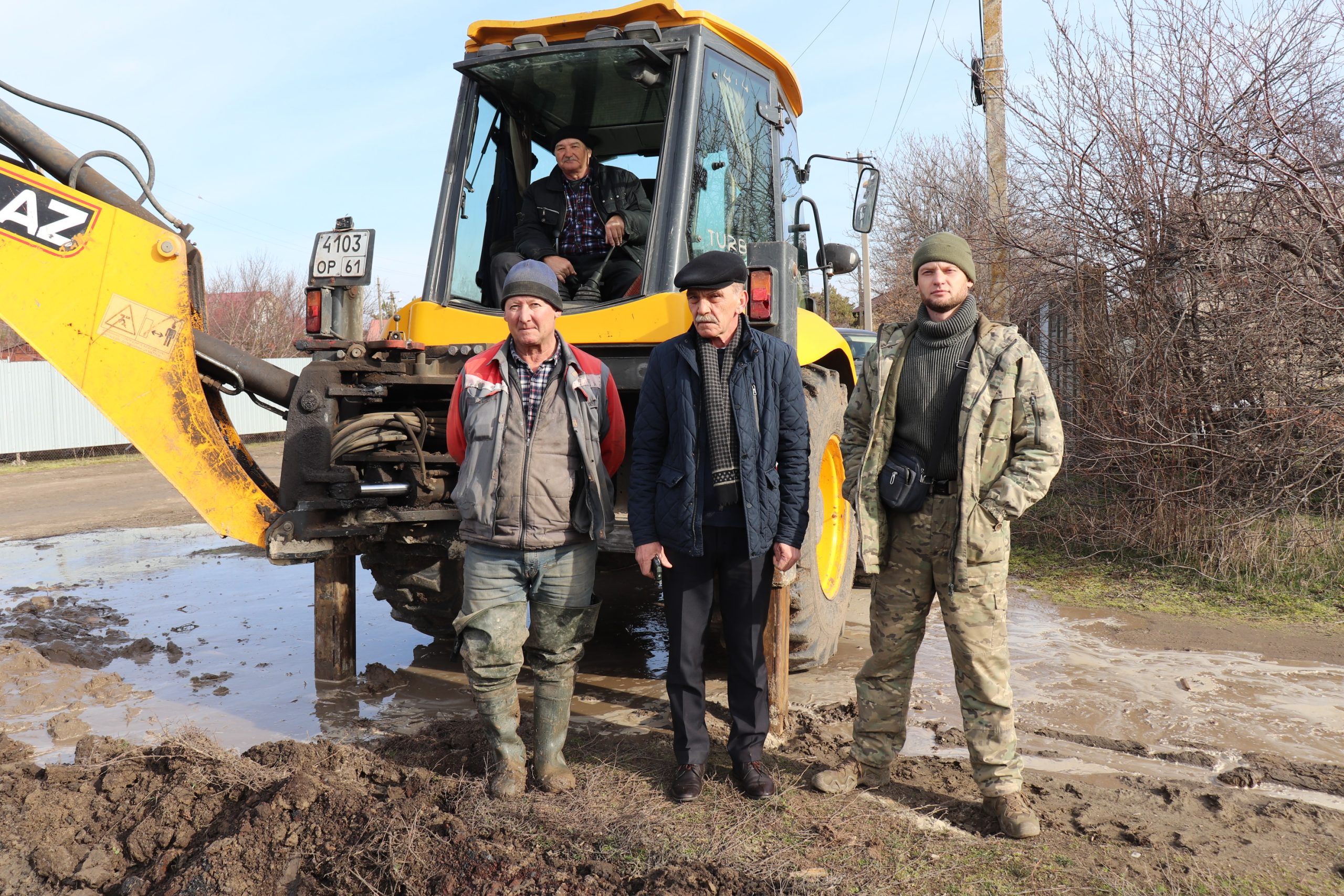 Произошёл порыв старой, ещё железной трубы. Такие сейчас уже и не ставятся — используются пластиковые. Экскаваторщик, вырыв ковшом яму, обеспечил доступ к порыву слесарям восстановительных работ, которые закроют место порыва хомутом из нержавеющей стали. Труд, как видите, физически тяжёлый и, откровенно скажем, грязный, на который согласится не каждый. И приходится им заниматься при любых погодных условиях, — комментирует ситуацию ведущий инженер — Александр Павлович Попов.