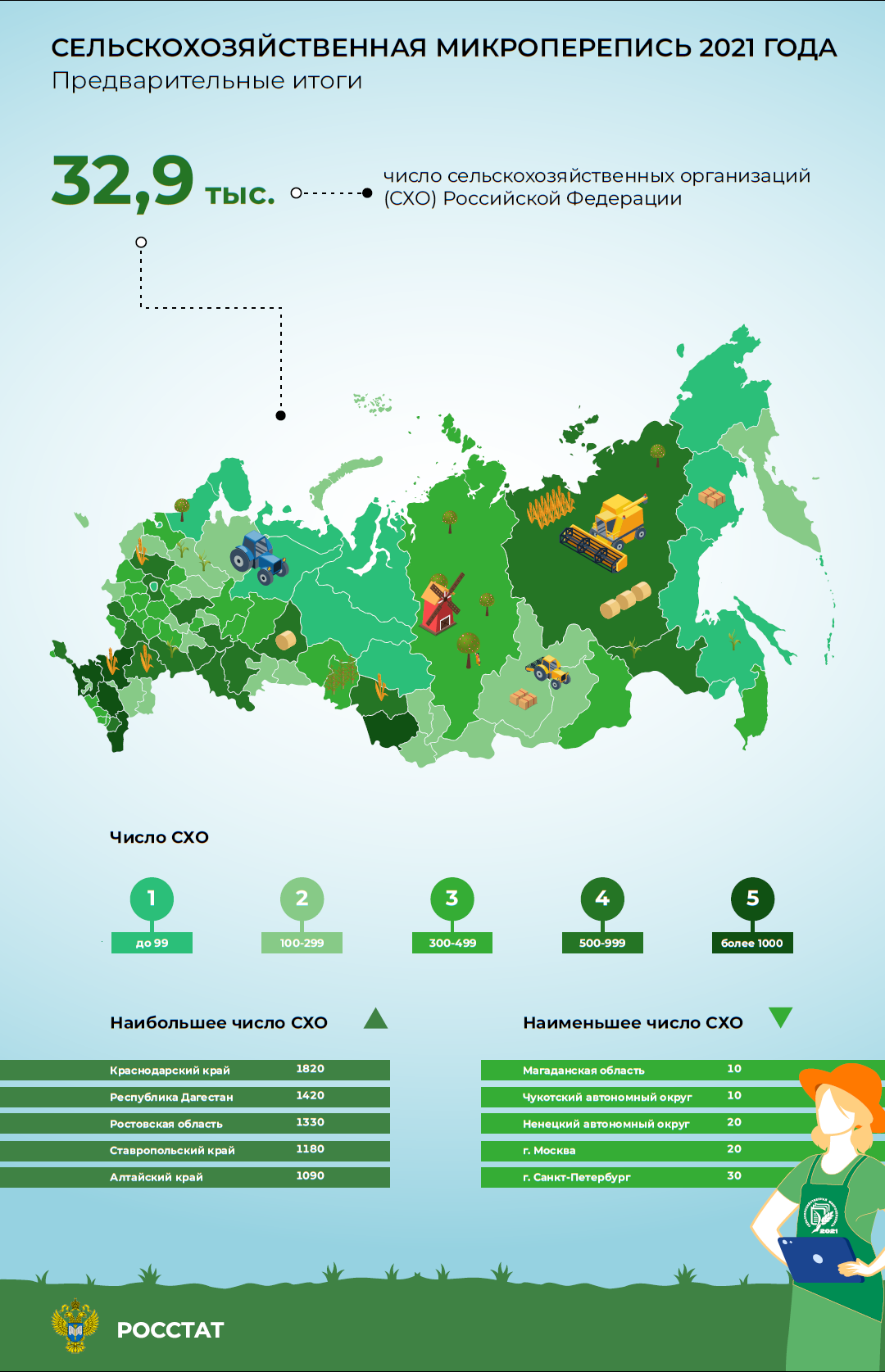 Ростовская область вошла в пятерку регионов с наибольшим числом сельхозорганизаций. Согласно данным сельхозмикропереписи, в Краснодарском крае зафиксировано 1,82 тыс. СХО, далее идет Республика Дагестан (1,42 тыс.), третья позиция у Ростовской области (1,33 тыс.), замыкают первую пятерку Ставропольский край (1,18 тыс.) и Алтайский край (1,09 тыс.).