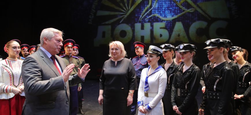 Губернатор Василий Голубев тепло поприветствовал артистов, перед началом концерта пообщался с коллективами донецкого «Донбасса» и ростовской «Легенды».