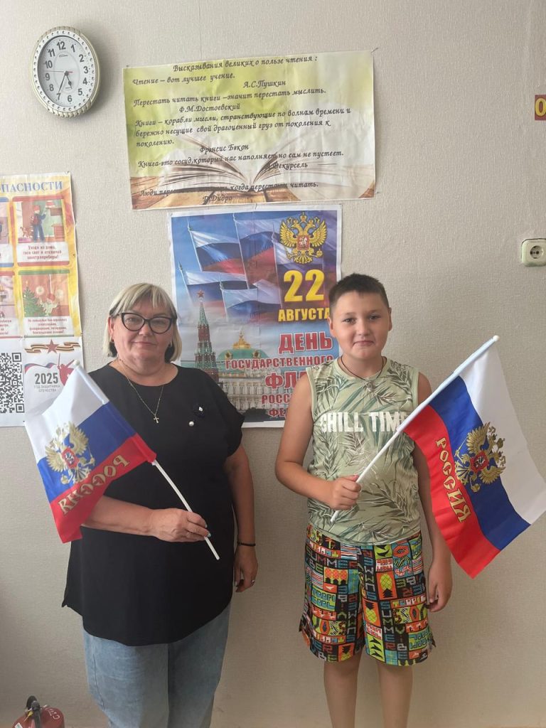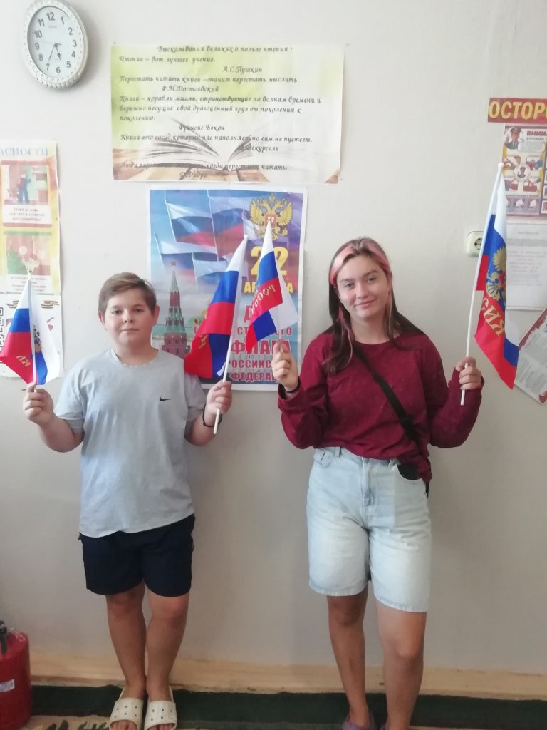 Во время встречи юные читатели говорили об основных государственных символах нашей страны: флаге, гербе и гимне, а также о том, что олицетворяют цвета полос Российского флага и золотой двуглавый орёл, изображённый на гербе нашей страны, а затем вспомнили текст государственного гимна.
