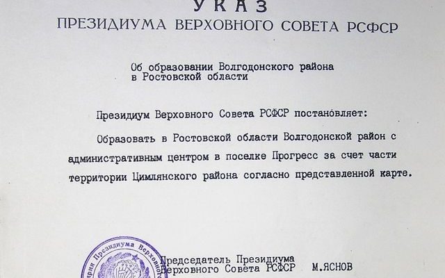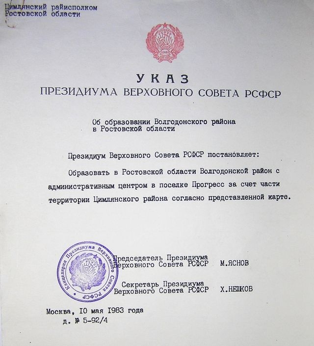 27 апреля принято решение исполнительного комитета Ростовского областного Совета народных депутатов № 310, а 10 мая 1983 года вышел Указ Президиума Верховного Совета РСФСР,  которым сформирован Волгодонской район с административным центром в п. Прогресс. Он стал 43-им районом в Ростовской области. В состав Волгодонского района включена левобережная часть Цимлянского района, 6 сельских советов: Добровольский, Дубенцовский, Победовский, Потаповский, Романовский и Рябичевский. Позже решением Волгодонского районного Совета народных депутатов № 143 от 16 мая 1984 года и решением исполнительного комитета Ростовского областного Совета народных депутатов № 535  от 24.10.1984 был образован еще один сельский совет – Прогрессовский.